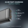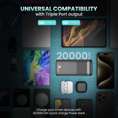 The triple output ports (2 USB-A + 1 Type-C) let you power three devices simultaneously, while the Type-C input port supports fast recharging in about 6–7 hours.