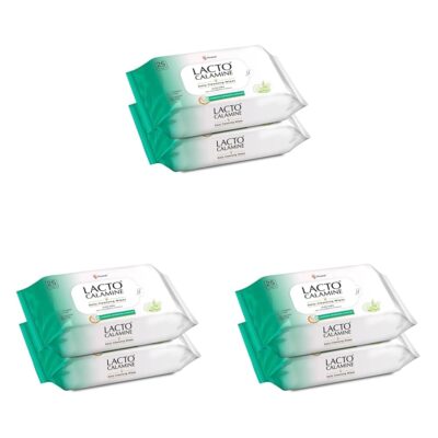 Lacto Calamine Daily Cleansing Facial Wipes 25N Each - Pack of 6 | Wet Wipes for Face with Aloe Vera, Cucumber & Vitamin E | Makeup Remover Wipes| Hydrating,Refreshing, Soothing|Paraben & Alcohol Free