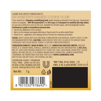 Compact and easy to carry, the 7g Lakme Sun Expert is perfect for quick touch-ups, leaving your skin looking matte, bright, and sun-safe all day long.