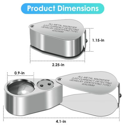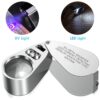 Compact 40X jeweler’s loupe with bright LED and UV lights, metal body, and optical glass lens—ideal for jewelry inspection, currency authentication, geology, crafts, and hobby use.