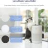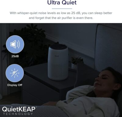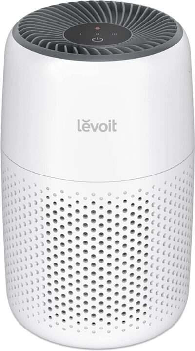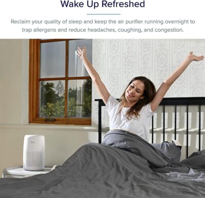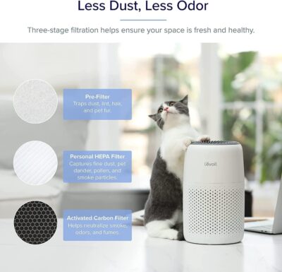 The LEVOIT Core Mini Air Purifier provides clean air for spaces up to 183 sq. ft., removing 99.97% of dust, smoke, and pollen. Its H13 True HEPA filter and fragrance sponge enhance air quality with a fresh scent.
