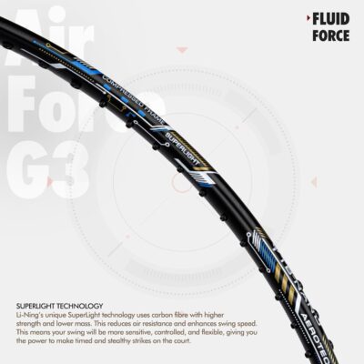 The Li-Ning Air-Force 80 G3 is a high-performance carbon fibre racket designed for adult players seeking power and precision. Expertly strung for optimal tension, it supports explosive smashes and quick reactions. Its aerodynamic frame reduces air resistance for faster swings. A full protective cover is included for safe storage and transport.