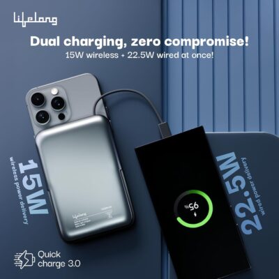 The Lifelong SnapVolt 10000 mAh MagSafe Power Bank delivers convenience and speed in one compact design. Featuring 15 W wireless and 22.5 W wired fast charging (QC 3.0) via dual Type-C outputs, it ensures quick and efficient power for your iPhone, Android, and other wireless-enabled devices.
