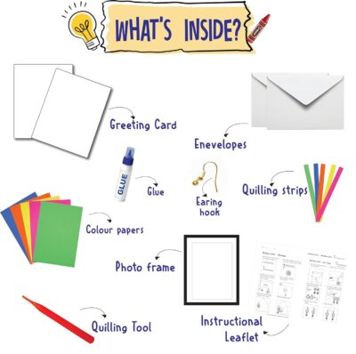 • All-in-One Quilling Kit – Includes quilling strips, photo frame, greeting cards, envelopes, glue, tool, flower punch, leaf cutouts, and earring hooks.