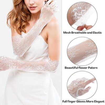 These Long Lace Gloves for Women are crafted to add timeless elegance and charm to any formal look. Made from soft, breathable white net fabric with a beautifully detailed floral lace design, they offer a graceful and sophisticated touch perfect for brides, bridesmaids, and anyone attending weddings or special events. The extended length enhances the beauty of your hands, giving a refined, vintage-inspired appeal that pairs effortlessly with bridal gowns, evening dresses, and party outfits. Ideal for weddings, receptions, photoshoots, proms, and other occasions, these stylish gloves elevate your overall look with subtle sophistication and classic style.