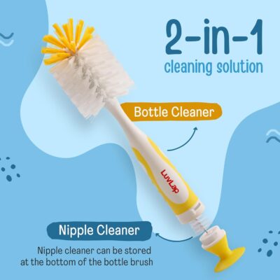 LuvLap 2- in -1 Bristle Baby Feeding Bottle Plastic Cleaning Brush&Nipple Cleaner,Grooved Handle with Suction Base,Easy to Clean Bottle Corners for Narrow Neck&Wide Neck Feeding Bottles,Yellow