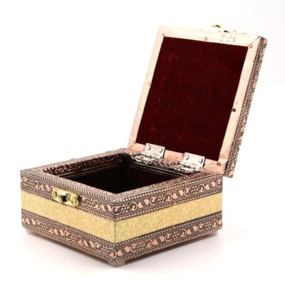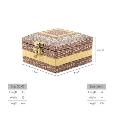 The macsen wooden jewellery box features a compact 4 x 4 x 2.5 inch design in an elegant golden and copper finish, perfect for storing bangles, earrings, necklaces, and small accessories. A beautiful gifting choice for anniversaries, weddings, and special occasions.