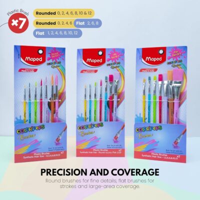 The Maped Plastic Handle Synthetic Paint Brush Set includes 7 versatile brushes in both round and flat shapes, ideal for a wide range of painting styles. Each brush features soft yet durable synthetic bristles that deliver smooth, even strokes and are easy to clean. The lightweight, ergonomic plastic handles ensure a comfortable grip, making them perfect for young artists and long painting sessions. With color-coordinated handles matching the bristle shades, this set is as fun as it is functional. Ideal for school art activities, DIY crafts, and creative play, the Maped Brush Set brings quality, convenience, and vibrant style to every painting project.