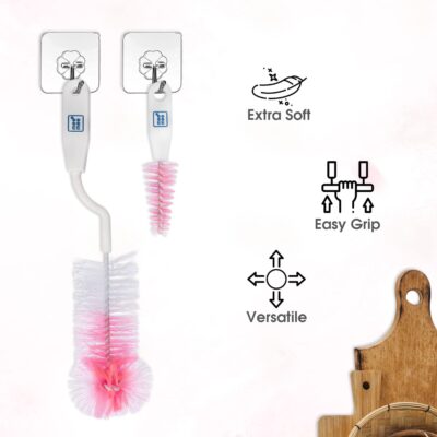 Mee Mee 360° Movable Nylon Bristle Baby Feeding Bottle & Nipple Cleaning Brush | Ergonomic Handle | Easy to Clean Bottle Corners for Narrow Neck & Wide Neck | BPA Free, Easy Hanging Storage | Pink