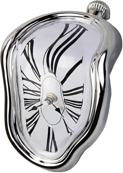 Be the first to review “Melting Clock for Desk Shelf Home Decor Office Melted Design Decorative Wall Clock – 4.5″ W x 7″ H – Silver – Analog Roman Numberics”