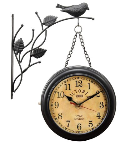 A 10-inch vintage antique double-sided station wall clock in black with Victoriya-style numbers. Ideal for adding classic railway charm to homes or offices.