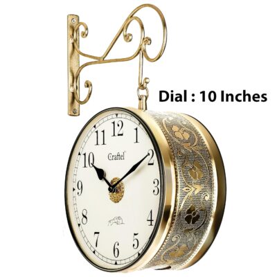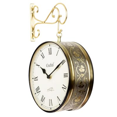This vintage-inspired station wall clock by CRAFTEL is crafted from durable metal and designed with a golden brass dial that adds a touch of elegance to any space. The double-sided display allows you to view the time from multiple angles, making it both stylish and functional. Measuring 10 inches, it is the ideal size to complement walls without overwhelming the décor. Its antique finish enhances traditional interiors while blending seamlessly with modern themes. Perfect for living rooms, hallways, offices, or cafes, this clock adds charm and utility in one timeless design.