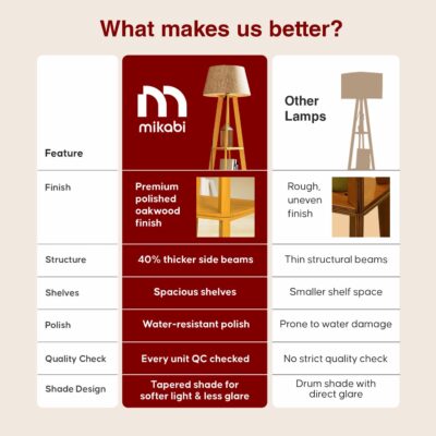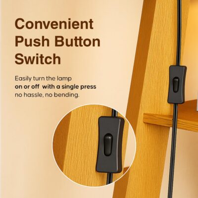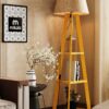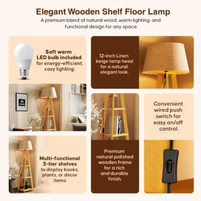Elegant wooden floor lamp with 3-tier shelves, natural linen shade, and energy-efficient LED bulb. Perfect for bedroom, living room, or corner spaces — combines lighting and storage in one stylish piece.