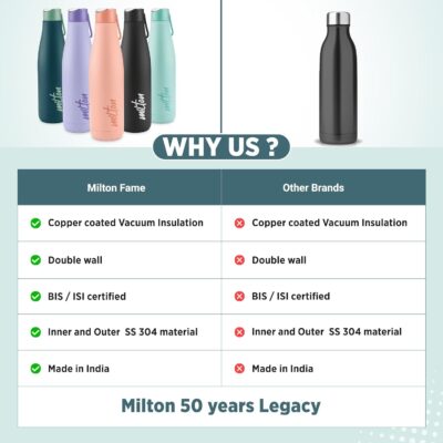 The Milton Fame 800 Thermosteel Water Bottle combines advanced insulation technology with stylish design. Its double-walled vacuum insulation ensures your drinks stay hot or cold for a full 24 hours, providing optimal hydration anytime. The 740ml capacity makes it compact yet spacious enough for daily use at work, gym, or school. The leak-proof lid ensures mess-free portability, while the aqua green color adds a fresh and vibrant touch. Crafted from premium stainless steel, it’s ISI certified for safety and long-lasting durability. Ideal for modern lifestyles, this bottle delivers performance, reliability, and style in one.