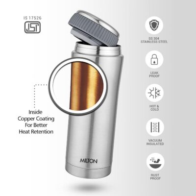 Keep your beverages at the perfect temperature for hours with Milton Optima 420 Thermosteel Flask. Made from durable 18/8 stainless steel with vacuum insulation and an inner copper coating for superior heat retention. ISI certified for safety and quality, this leak-proof, rust-free flask is perfect for tea, coffee, or juice—whether at home, office, or on the go.
