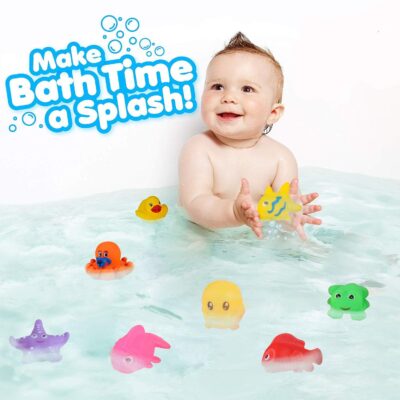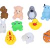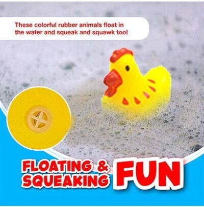 Each toy squeaks when squeezed, adding extra fun and stimulating auditory senses. They float on water, turning bath time into an imaginative play experience while helping develop hand-eye coordination and motor skills. The bright colors and cute animal designs capture children’s attention, keeping them entertained while also making bathing stress-free for parents.