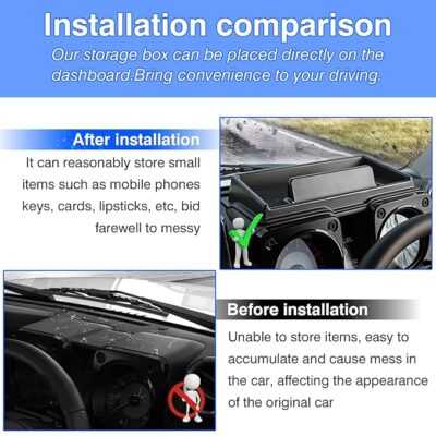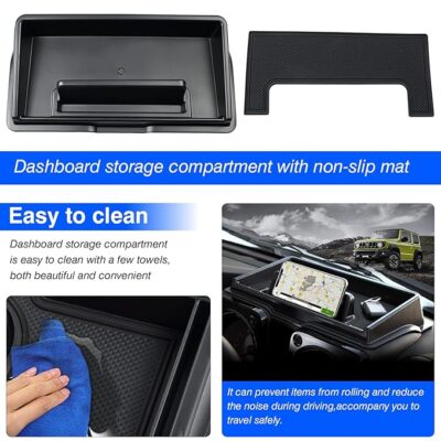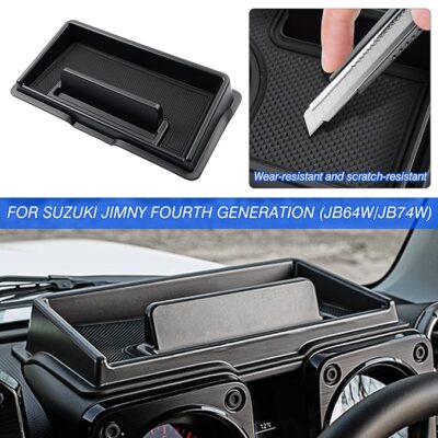 The Mixsuper Dash Center Console Organizer is a tailored storage solution designed specifically for the 2019–2023 Suzuki Jimny JB64W and JB74W models, providing a perfect fit that enhances the functionality of your dashboard area. Made from durable ABS plastic, this sleek black console tray offers robust storage without deformation or unpleasant odors, ensuring long-lasting use. It expands your vehicle’s storage space, letting you neatly organize essentials like your phone, sunglasses, keys, coins, cards, and more for quick access while driving. The organizer includes a non-slip mat to prevent items from sliding around and reducing noise, and its easy peel-and-stick installation attaches securely without damaging the dashboard, while still allowing removal if needed.  This practical accessory brings convenience and helps keep your Jimny’s interior tidy and clutter-free.