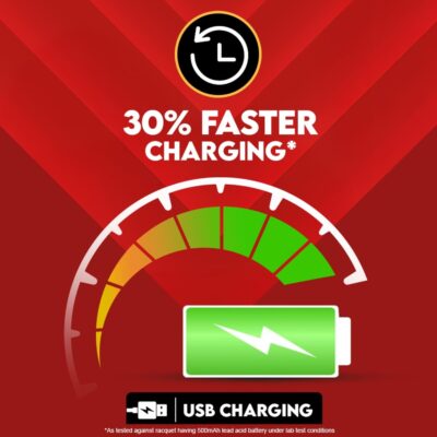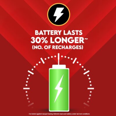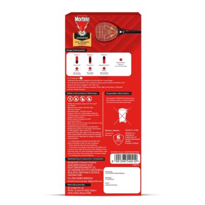 Stay protected with the Mortein Advanced Anti-Mosquito Racquet, designed for fast, powerful, and long-lasting mosquito control. Its USB-C fast charging offers 30% quicker power-up, while the advanced lithium-ion battery delivers 30% longer backup for extended performance. The high-voltage grid kills mosquitoes instantly, and the bright LED light ensures easy targeting even in low-light corners. Built with durable materials for everyday use, this racquet combines speed, strength, and reliability. With a 6-month hassle-free warranty, it gives you peace of mind and continuous protection.