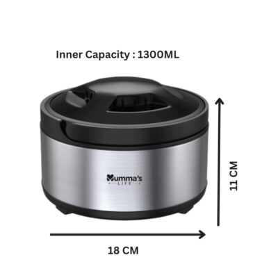Mumma’s LIFE Thermoware Casserole is a 1500ml stainless steel double-wall insulated hot pot designed to keep roti, meals, and curries hot for hours. Its secure lid and durable construction make it ideal for home or travel use.