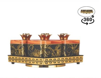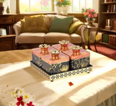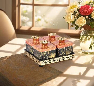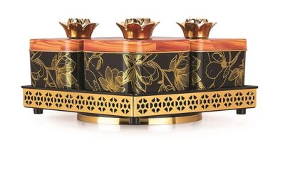 The Nabhya Sparkle 4-Piece 360° Revolving Airtight Dry Fruit Container Set is a stylish and practical serving solution designed to elevate both everyday use and special occasions. This elegant black set includes four airtight containers neatly placed on a smooth rotating serving tray, allowing easy access to contents with a simple spin. Ideal for serving dry fruits, sweets, candies, pickles, mukhwas, chocolates, and snacks, the secure lids help retain freshness while keeping items hygienically stored. The compact, space-saving design makes it perfect for dining tables, coffee tables, and festive spreads, while its modern look adds a touch of sophistication to your home décor. Durable, easy to maintain, and visually appealing, this revolving dry fruit box is also an excellent choice for festive gifting, housewarmings, and celebrations.