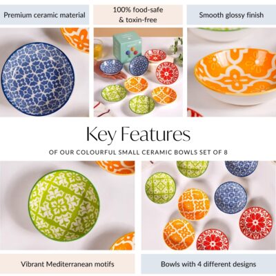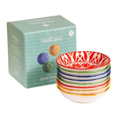 The Nestasia Set of 8 Small Ceramic Plates brings color, craftsmanship, and versatility to your dining table. Each 70 ml plate is designed with vibrant Mediterranean-inspired motifs — four unique designs with two plates in each style — adding a lively touch to every meal or gathering.