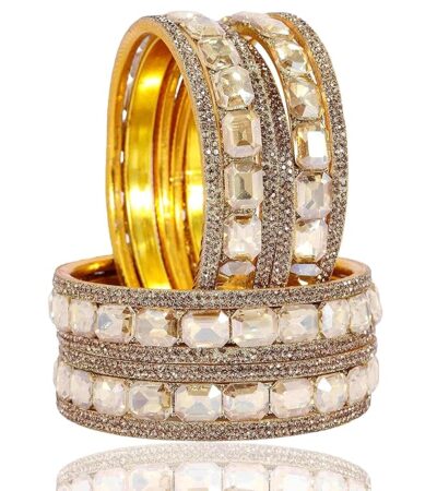 Enhance your jewellery collection with this elegant NMII bangles and kada set, beautifully crafted in premium gold-plated metal and adorned with sparkling American Diamond (AD) stones. Designed to offer a perfect blend of traditional charm and modern style, this fashionable set of 12 bangles adds a radiant touch to any outfit. The rich gold finish combined with shimmering stone detailing makes it ideal for weddings, parties, festive celebrations, and even daily wear. Lightweight and comfortable, these bangles can be worn together for a grand look or styled individually for subtle elegance. A versatile and stylish accessory, this set also makes a thoughtful gift for women and girls who love trendy yet timeless jewellery.