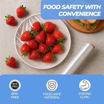 Made from food-grade material, this cling film offers good stretch and strong cling to securely wrap fruits, vegetables, leftovers, cooked meals, and food containers.
