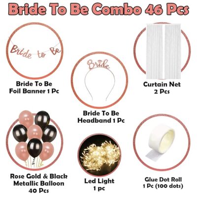 The Party Props Bride to Be Decoration Set includes 46 beautifully coordinated pieces in an elegant rose-gold and black theme, making it a complete décor solution for bachelorette parties, bridal showers, and pre-wedding celebrations. This premium kit features 40 metallic-finish balloons, a stylish “Bride to Be” banner, and a satin sash, all designed to create a glamorous and photo-ready celebration setup. The combination of bold colors, shimmering accents, and high-quality materials instantly transforms any space into a festive, picture-perfect party backdrop. Easy to assemble and suitable for homes, hotel rooms, or event venues, this set enhances the party atmosphere and makes the bride feel truly special. Perfect for group photos, décor styling, and unforgettable moments, this 46-piece kit brings charm, sparkle, and sophistication to every bridal event.