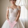 Crafted with delicate net lace and finished with an elegant bow and lace cuff, these stylish mittens beautifully complement bridal gowns, party dresses, and formal attire.