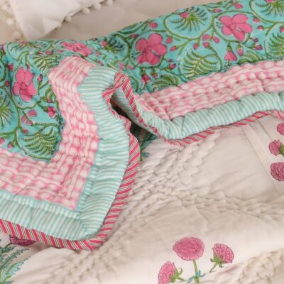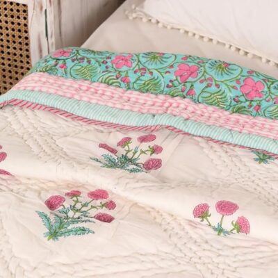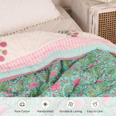 This beautifully crafted single-bed quilt from the Peepul Tree brand features premium cotton malmal fabric, renowned for its buttery-soft hand and breathable comfort. The reversible design offers two looks in one: one side in a soothing turquoise shade and the other in a soft pink, both adorned with elegant hand-block Jaipuri floral prints—bringing artisanal Indian charm to your bedding. Lightweight yet cozy, this quilt is ideal as an AC or year-round blanket thanks to its airy cotton construction and fine stitching, which keeps the fill evenly distributed and ensures no lumps. Made in India, it underscores traditional craftsmanship with modern convenience. The generous size (60 × 90 inches) fits standard singles and offers ample coverage, while maintenance is simple: machine-washable, pre-shrunk, and designed for everyday use with lasting color and form. A stylish, breathable and reversible option for elevating your bedroom décor while staying comfortable.