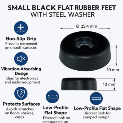 Set of 4 flat rubber feet with steel washers for stable, non-slip, and vibration-free support. Ideal for electronics, furniture, and AV equipment.