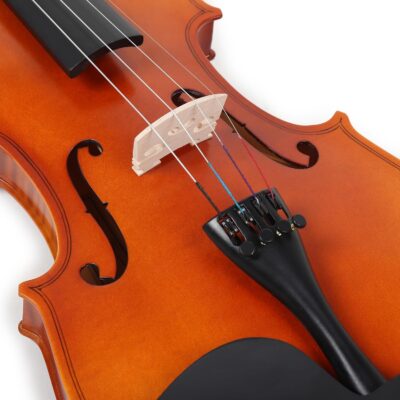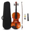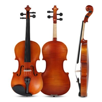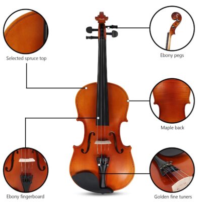 The set includes a Brazil wood bow for precise control, rosin to enhance bow grip, a hard protective case for safe storage and transport, a fingerboard sticker to assist with finger placement, and a violin mute for quieter practice sessions.