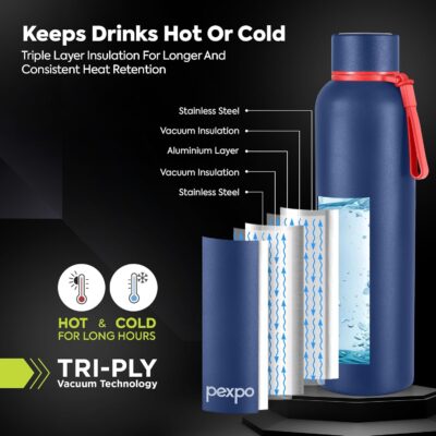 Meet the Pexpo Bravo 1000 ISI Certified Stainless Steel Water Bottle, engineered for superior insulation, durability, and everyday convenience. Designed with Tri-Ply Vacuum Technology (TPVT) — a unique three-layer construction with a thick aluminum core sandwiched between dual stainless steel walls — it ensures maximum temperature retention, keeping beverages hot or cold for extended hours.