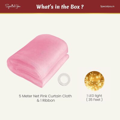 Create a dreamy and aesthetic ambiance with this 5-meter unstitched pink canopy net cloth, designed for bedroom décor, event styling, and DIY decoration projects. Made from high-quality, soft, and durable net fabric, it can be easily cut, shaped, or draped to suit your canopy, curtain, backdrop, or craft needs. The set includes decorative lights that add a warm, magical glow—perfect for romantic setups, kids’ rooms, festive décor, or photoshoot backgrounds. Versatile and elegant, this canopy net cloth enhances both home interiors and event venues with its soft pink charm.