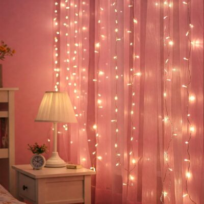 Soft and durable 5-meter pink net cloth with decorative lights, perfect for creating canopy tents, backdrops, or aesthetic room décor. Easy to cut, shape, and use for DIY home or event decoration.