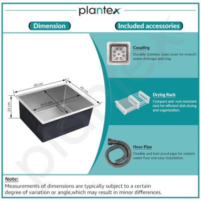 Plantex Heavy-Duty Stainless-Steel Kitchen Sink/Heavy-Duty Sink for Kitchen with 25 Years Warranty by Plantex/Single bowl Sink Square Coupling, Hose Pipes and Drain Rack (Matt-24 x 18 x 9 Inches)
