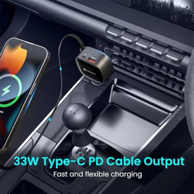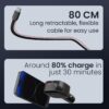 Featuring dual USB ports — an 18 W USB Type-A and a 33 W Type-C PD port — plus an 80 cm retractable Type-C cable, this charger lets you charge up to three devices simultaneously without cable clutter.