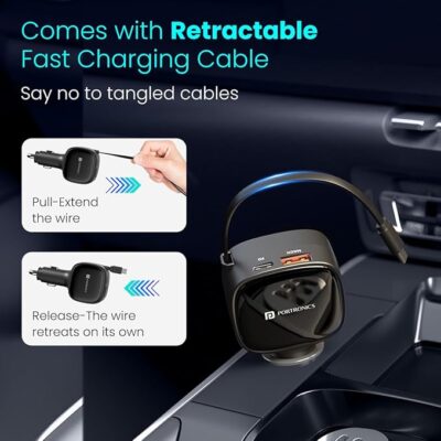 Portronics Car Power Retracto 84W 3‑in‑1 Car Charger is a high-performance car charging solution designed to keep all your devices powered on the go with convenience and efficiency. It delivers a total output of up to 84 W, allowing for fast charging of multiple gadgets during drives, road trips, or daily commutes. Featuring dual USB ports — an 18 W USB Type-A and a 33 W Type-C PD port — plus an 80 cm retractable Type-C cable, this charger lets you charge up to three devices simultaneously without cable clutter. The retractable cable design helps maintain a tidy cabin by retracting smoothly when not in use, while the compact form factor fits easily into your car’s cigarette lighter socket and stores in glove compartments or console spaces. Whether you’re powering up laptops, Android phones, iPhones, earbuds, tablets or other USB-powered devices, this black Portronics charger adds reliable and versatile charging capability to your car interior.