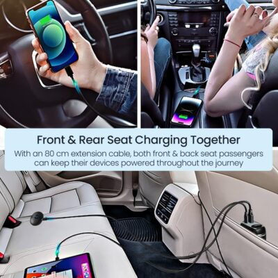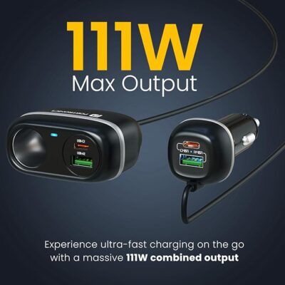 Portronics Car Power Trail 111W Car Charger is a high-performance 4-port fast car charging solution designed to keep all passengers powered on long drives and road trips. It features dual 30W Type-C Power Delivery (PD) ports and dual 22.5W USB-A ports, enabling simultaneous fast charging of up to four devices without compromising speed or safety. With a front & back seat charging design via an extended cable and cigarette lighter socket, it ensures convenient access for both driver and rear passengers. Ideal for smartphones, tablets, earbuds, power banks, and other USB devices, this charger is built with advanced multi-layer protection against over-voltage, over-current, overheating, and short circuits. Compact, travel-friendly, and powerful, the Portronics Car Power Trail 111W is an essential car accessory for family trips and daily commutes.
