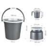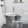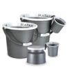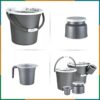5-piece silver plastic bathroom set with buckets, stool, and mugs for daily use.