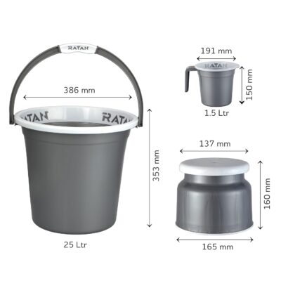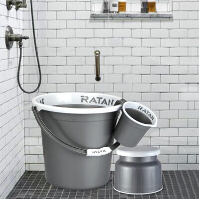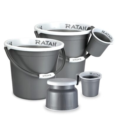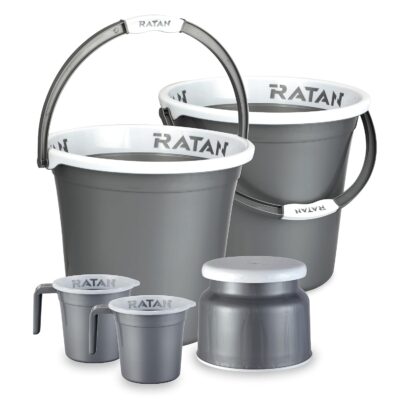The RATAN Plasticware Bathroom Set includes five essential items in a sleek NIR Silver finish for a coordinated bathroom look. It comes with two 25-litre Gloria Plain buckets, a Nova stool (Patla 107), and two 1.5-litre Gloria Plain bath mugs. Made from high-quality plastic, this set offers durability, comfort, and style. Ideal for everyday home use, it combines practicality with a modern touch.