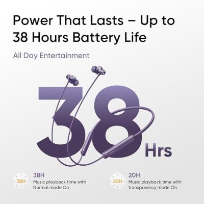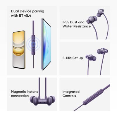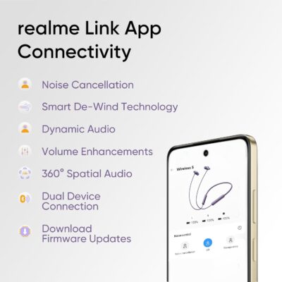 The realme Buds Wireless 5 ANC Bluetooth neckband earphones are engineered to deliver a premium wireless listening experience with powerful features ideal for everyday use. They come with up to ~50 dB Hybrid Active Noise Cancellation (ANC) to significantly reduce ambient noise so you can enjoy music and calls with minimal distraction. Equipped with large 13.6 mm dynamic bass drivers and 360° Spatial Audio, these earphones produce rich, immersive sound with deep bass and detailed clarity. With Bluetooth 5.4 and dual-device pairing, you can stay connected to two devices at once with stable connectivity, while 45 ms low latency helps keep audio in sync during gaming and video playback. The built-in 5-mic ENC (Environmental Noise Cancellation) ensures clearer voice quality on calls, and IP55 dust and water resistance makes them suitable for workouts and outdoor use. A long-lasting battery life of up to ~38 hours on a single charge (with quick charging offering up to ~20 hours from just a short boost) keeps the music going throughout the day.