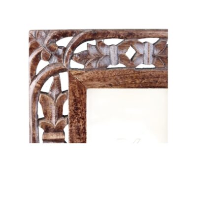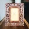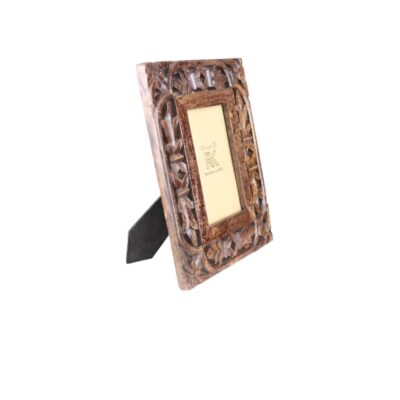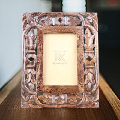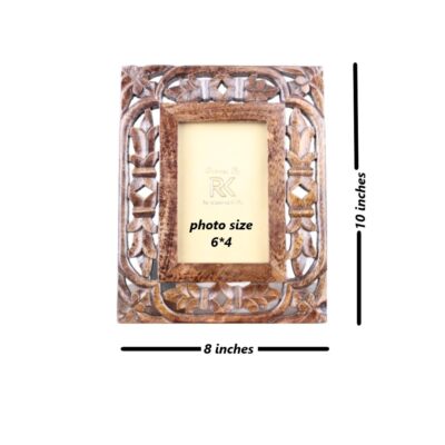 Elegant handcrafted wooden photo frame with intricate carving and warm brown finish. Perfect for tabletops or walls, adding a vintage ethnic touch to any room.