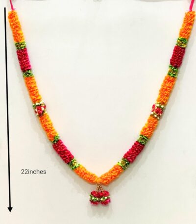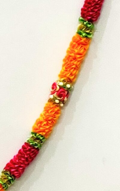 The RJ SALES & PROMOTIONS Closely Knitted Garland is a beautifully handcrafted 23-inch mala made with vibrant red and yellow satin flowers and finished with an elegant golden tissue lace. Designed with precision and rich detailing, this garland offers a premium traditional look, making it ideal for deity idols, photo frames, fancy dress events, weddings, poojas, and other auspicious occasions. The soft satin flowers provide a luxurious feel, while the golden lace adds a touch of festive elegance. Durable, lightweight, and visually striking, this versatile mala enhances the beauty of any setup, making it perfect for both decorative and ceremonial use.