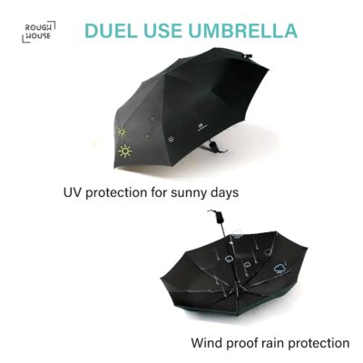 Stay protected in every season with the Roughhouse UV Umbrella, designed for both intense sun and sudden rain. Featuring a superior SPF 50+ UV coating, it shields you from harmful rays while keeping you cool. Its one-click auto open/close mechanism ensures quick handling, so no more struggling during downpours. The strong, wind-resistant frame stays sturdy without flipping, while the large canopy offers ample coverage. Despite its big shade, the umbrella folds into a compact size, making it easy to carry in bags, backpacks, or your car. Finished in a sleek black design with a matching sleeve, it’s practical, stylish, and perfect for everyday use or gifting.