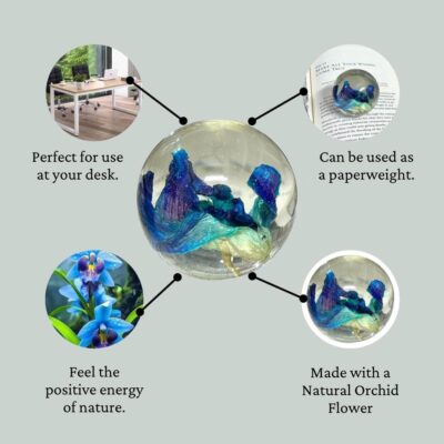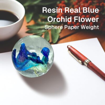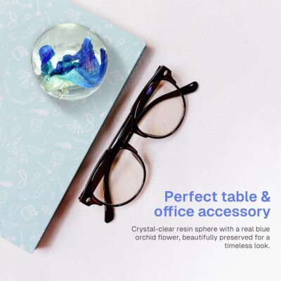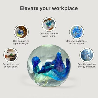 Elegant resin sphere paperweight with a real blue orchid, ideal for office desks, study tables, and thoughtful gifting.