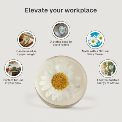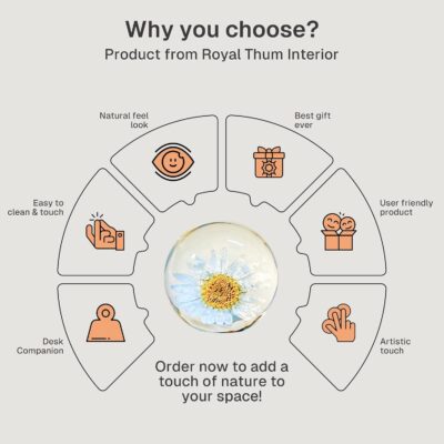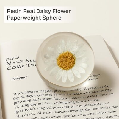 This RoyalThum Resin Daisy Sphere Paperweight features a genuine pressed daisy encased in a crystal-clear resin sphere, bringing nature’s charm to your desk or décor space. Handcrafted with a smooth 50mm finish, it works beautifully as both a decorative showpiece and a practical paperweight. Perfect for office desks, study tables, meditation corners, or display shelves, it adds elegance and tranquility to any setting. A unique and heartfelt gift for nature lovers, colleagues, teachers, and friends.
