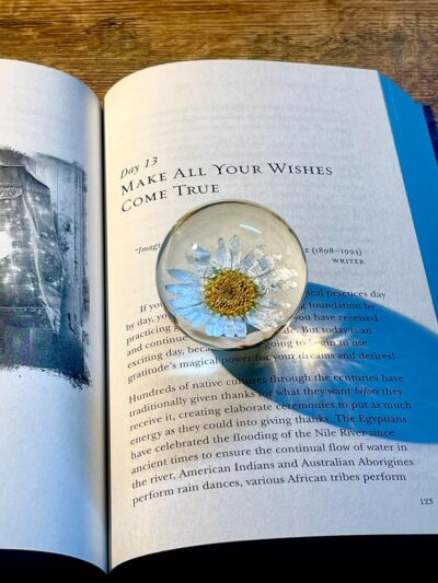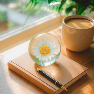 Handmade resin sphere paperweight with a real pressed daisy, perfect for elegant desk décor and thoughtful gifting.