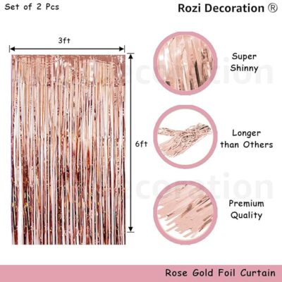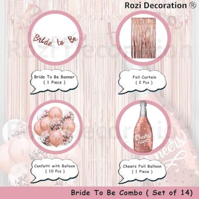 The Rozi Decoration Bride to Be Combo is a stylish rose-gold themed set of 14 pieces designed to create a beautiful and festive atmosphere for bridal showers, bachelorette parties, and pre-wedding celebrations. This coordinated décor kit includes a “Bride to Be” banner, rose-gold balloons, a foil fringe curtain, and additional decorative elements perfect for enhancing party entrances, photo backdrops, and celebration corners. Made from high-quality materials, each item adds shimmer, elegance, and a modern touch to the event while ensuring durability throughout the party. Easy to assemble and suitable for homes, hotel rooms, or event halls, this 14-piece combo helps set the perfect mood for the bride, groom, and family, making the celebration memorable, fun, and beautifully themed.