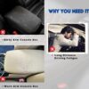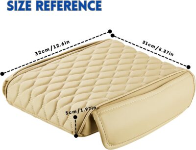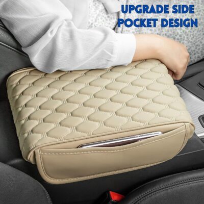 The RT6 Universal Car Center Console Cover Armrest Cushion in beige features memory foam, leatherite finish, and two side storage pockets, providing comfort and practical storage for all SUVs.